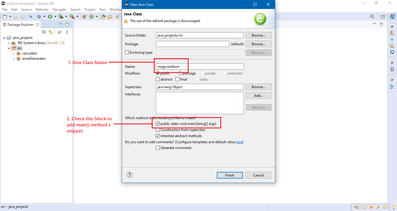 Once you do all the changes mentioned above, click on Finish. This will create a new magicianNum class having main () method.